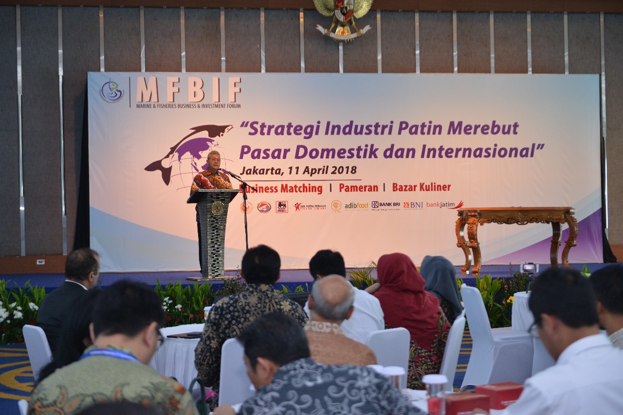 Direktur Jenderal Penguatan Daya Saing Produk Kelautan dan Perikanan (PDSPKP) Nilanto Perbowo, saat menyampaikan sambutan pada acara Marine and Fisheries Business and Investment Forum yang bertajuk “Industri Patin : Peluang dan Tantangan” di jakarta.(11/4)