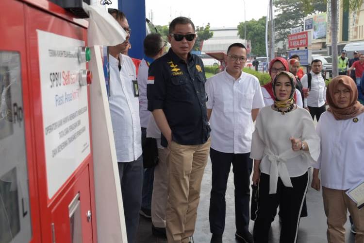 Sebelum ke TBBM Cikampek Jonan beserta jajaran juga sempat meninjau SPBU di rest area tol Cikampek kilometer 57.