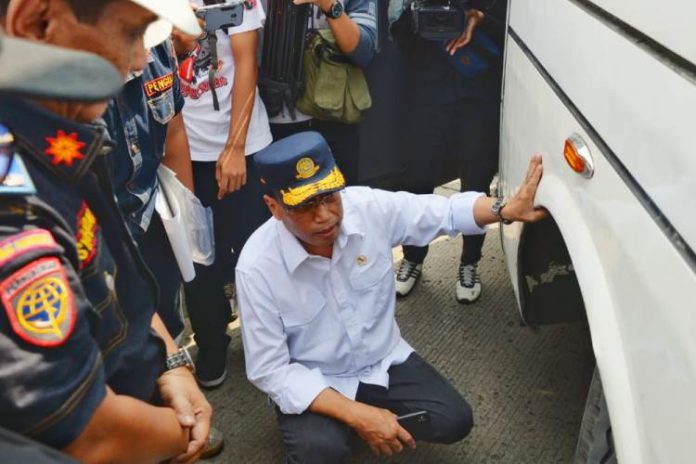 Dalam kunjungannya kali ini, Menhub juga melakukan rampcheck bus-bus yang akan digunakan dan menemukan satu bus yang tidak laik, dan harus dikandangkan.