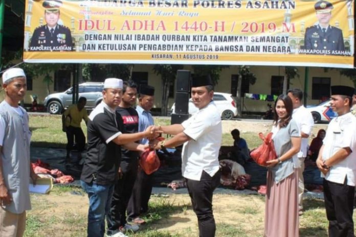 Asahan, PONTAS.ID – Pada perayaan Idul Adha 1440 H/2019 kali ini Polres Asahan menyembelih 6 ekor sapi sebagai untuk dibagikan kepada keluarga yang kurang mampu. Penyembelihan hewan kurban tersebut dilakukan di areal komplek Mapolres Asahan, Kisaran, Sumatera Utara.