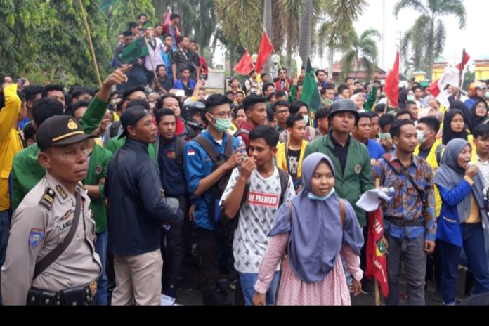 Asahan, PONTAS.ID – Dengan memakai jaket almamater kebanggaan mereka masing-masing, ratusan massa dari berbagai organisasi Mahasiswa yang ada di Kabupaten Asahan, siang tadi menggeruduk Kantor DPRD Asahan, Kisaran, Sumatera Utara, Rabu (25/9/2019).