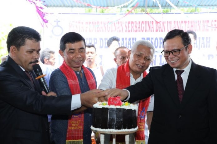 Asahan, PONTAS.ID – Jemaat Gereja HKBP Resort Desa Gajah, menggelar acara pesta pembangunan gedung serbaguna dan HUT ke-65 Gereja HKBP Resort Desa Gajah, Distrik XIII Asahan-Labuhan Batu, di Kecamatan Meranti, Asahan, Sumatera Utara, Minggu (27/10/2019).
