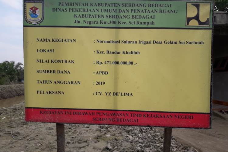Dari papan informasi di lapangan, diketahui proyek normalisasi irigasi sepanjang 5,3 Km ini dikerjakan oleh CV. Yz De’lima dengan nilai kontrak Rp.471 juta dari APBD Kanupaten Sergai Tahun Anggaran 2019.