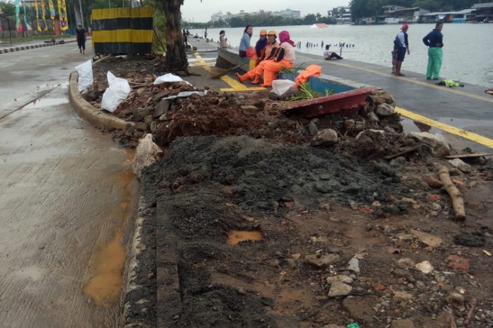 Sisa-sisa material serta sampah berserakan di lokasi, bahkan kondisi trotoar yang berada tepat di sebelah danau tampak rusak tanpa ada perbaikian.