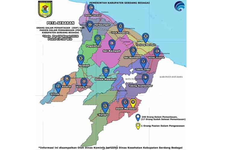 Sergai, PONTAS.ID – Tim Gugus Tugas Covid-19 Pemerintah Kabupaten Serdang Bedagai (Sergai) mencatat, 240 orang saat ini berstatus ODP (orang dalam pemantauan) dan satu orang berstatus PDP (pasien dalam pengawasan) dari 17 kecamatan di Sergai, per Kamis (26/3/2020)..