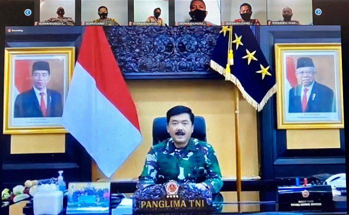 Jakarta, PONTAS.ID – Pembangunan nasional untuk mewujudkan visi Indonesia Maju sarat dengan berbagai tantangan, baik internal maupun eksternal,” ucap Panglima TNI Marsekal TNI Hadi Tjahjanto, saat memberikan pembekalan kepada 1.543 peserta seminar virtual, terdiri dari 214 orang Sesko TNI, 103 orang Sespimti Polri, 499 orang Seskoad, 241 orang Seskoal, 235 orang Seskoau, dan 251 orang Sespimmen Polri pada acara Program Kegiatan Bersama Kejuangan tahun 2020 di Mabes TNI, Cilangkap, Jaktim, Selasa (28/7/2020).