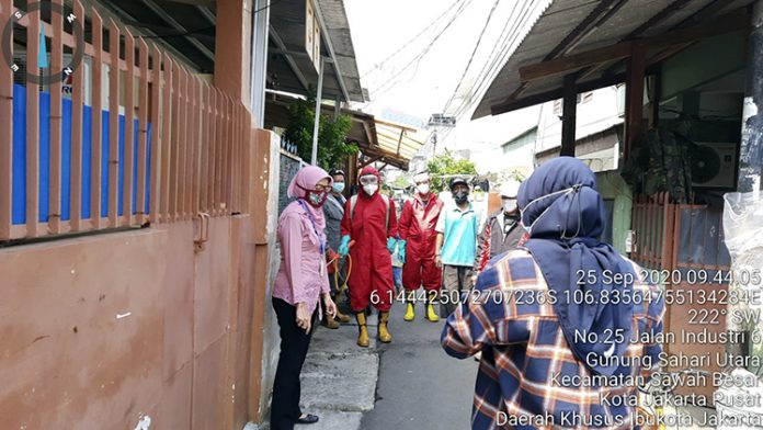 Jakarta, PONTAS.ID – Suku Dinas Penanggulangan Kebakaran dan Penyelamatan (Gulkarmat Jakarta Pusat) melakukan penyemprotan cairan disinfektan di wilayah RW 01 dan 03 Kulurahan Gunung Sahari Utara (GSU), Sawah Besar, Jakarta Pusat, Jumat (25/9/2020).