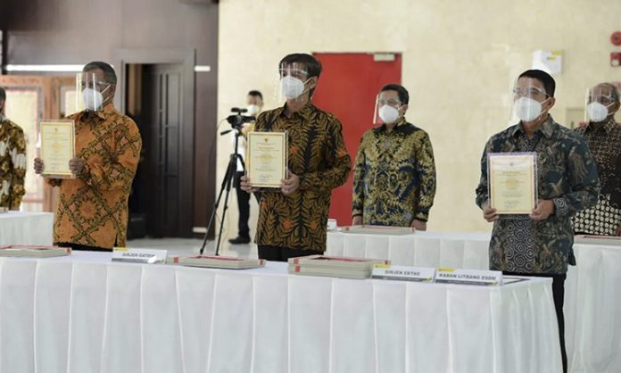 Jakarta, PONTAS.ID – Menteri Energi dan Sumber Daya Mineral (ESDM), Arifin Tasrif, memberikan penghargaan Dharma Karya Energi secara simbolis ke sejumlah pejabat tinggi Madya di lingkungan Kementerian ESDM serta Badan Usaha Milik Negara (BUMN) sektor ESDM.