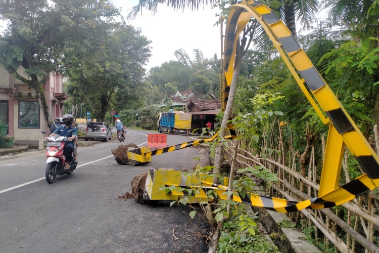 Saat ini arus lalu lintas khususnya di sebelah selatan jembatan Plengkung Bendo terhambatk arena separuh badan jalan tidak bisa difungsikan.