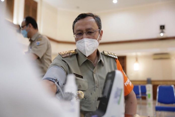 Jakarta, PONTAS.ID – Walikota Administrasi Jakarta Pusat Dhany Sukma menjalani vaksinasi Covid-19, di Ruang Serbaguna Utama Kantor Wali Kota Jakarta Pusat, Jalan Tanah Abang l, Gambir, Senin (8/3/2021).