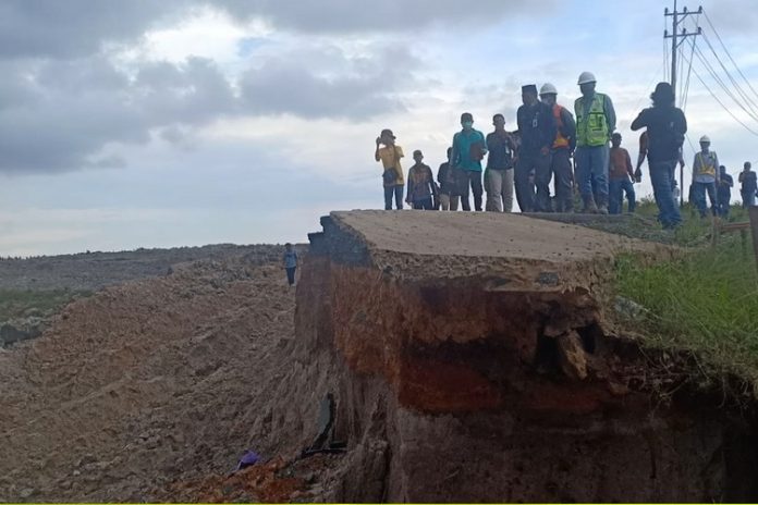 Jalan longsor terjadi sebelum lebaran Idul Fitri 1442 H dengan didahului munculnya retakan. Namun tak ada tanggapan dari perusahaan hingga akhirnya longsor beberapa hari kemudian. Kondisi ini membuat masyarakat geram melihat aktivitas tersebut yang akibatkan transportasi warga terganggu.