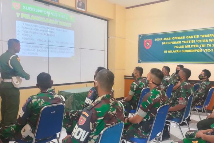 Tanah Bumbu, PONTAS.ID- Komandan Kodim 1022/ Tanah Bumbu, Letkol Cpn Rahmat Trianto, MSi, MTr (Han) kirimkan personil Provos mengikuti Sosialisasi Operasi Penegakan Ketertiban (Ops Gaktib) dan Operasi Yustisi TA 2022 di Subdenpom VI/2-3 Batulicin, Rabu (2/3/2022).