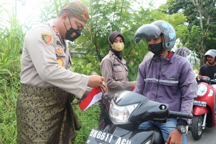 Sergai, PONTAS.ID – Untuk memeriahkan Hari Ulang Tahun (HUT) Kemerdekaan RI ke-77 dan bentuk dukungan serta partisipasi Gerakan Pembagian 10 Juta Bendera Merah Putih oleh Polda Sumatera Utara, Kapolres Sergai AKBP Ali Machfud dan jajaran memberikan Bendera Merah Putih sebanyak 1000 Bendera kepada warga pengguna jalan umum, Selasa (16/8/2022).