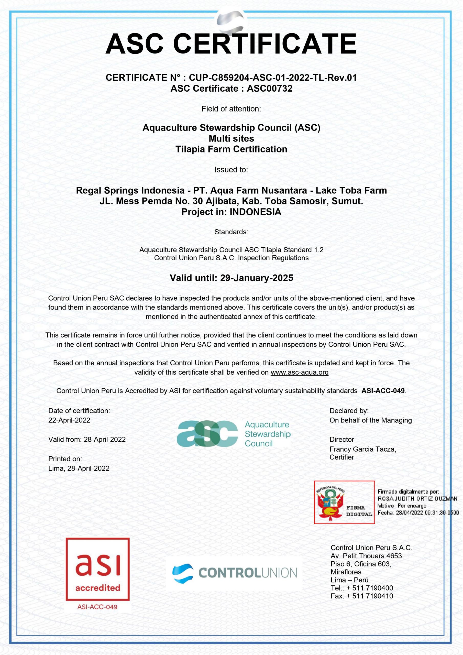 “Sertifikasi ASC telah memberikan perusahaan banyak manfaat, diantaranya data yang terorganisir dengan baik, yang perusahaan bagikan secara transparan pada audit dan laporan ASC; peningkatan ketertelusuran, mulai dari pemberian pakan hingga panen, Standar Pemberian Pakan ASC mendatang akan semakin meningkatkan sumber pakan di budidaya kami dan peningkatan yang berkelanjutan atas tanggung jawab sosial baik bagi internal dan pihak eksternal,” papar Rudolf.