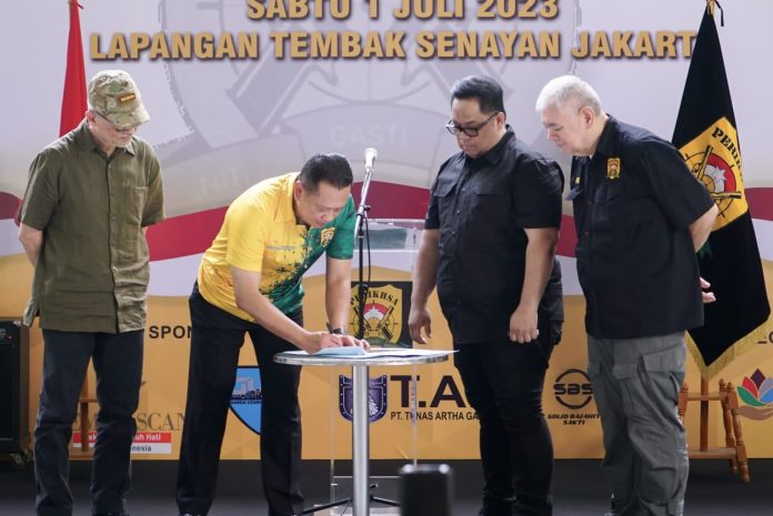 Jakarta, PONTAS.ID – Ketua Umum Perkumpulan Pemilik Izin Khusus Senjata Api Beladiri (PERIKHSA) Bambang Soesatyo bersama CEO PT Dwimitra Pasifik Internasional Guntur Muchtar menandatangani Perjanjian Kerjasama antara PERIKHSA dengan PT Dwimitra Pasifik Internasional tentang produksi dalam negeri bersama PT PINDAD senjata api beladiri.